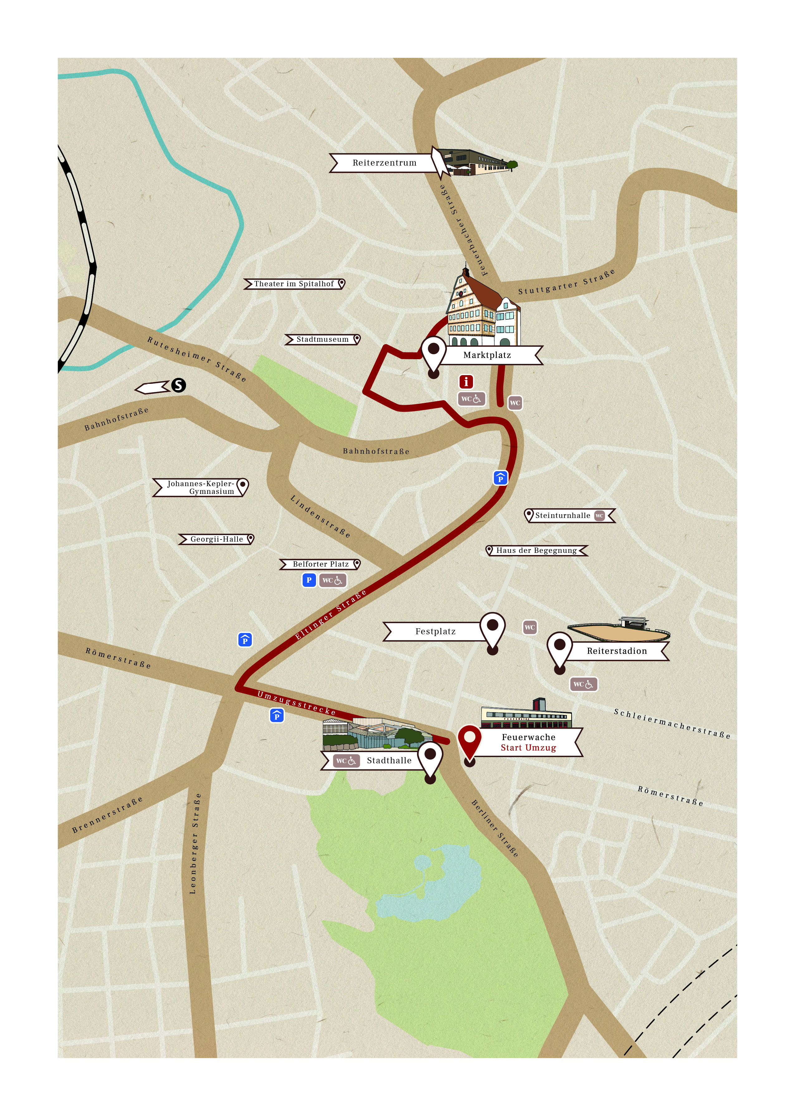 Im Übersichtsplan zum Leonberger Pferdemarkt sind alle relevanten Veranstaltungsstätten, Parkmöglichkeiten und Toiletten eingezeichnet.