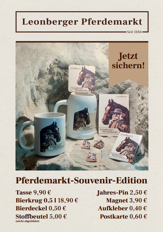 Neben den Pferdemarkt-Souvenirs bietet das Stadtmarketing die neue "5-Sehenswürdigkeiten-Edition" an. Sie besteht aus Tassen und passenden Magneten. Pomeranzengarten, Engelbergturm und auch die rockige Variante des Leonberger Hundes runden das Souvenirs-Angebot ab – auf Tassen, Taschen, Shirts, Kissen, Schirmen, Magneten, Bierdeckeln, Postkarten, Lesezeichen und vielem mehr. Auch die Freunde des Leonberger Hundes kommen voll auf ihre Kosten: Mit dem Leonberger-Hund-Pin können sie sich mit dem Sympathieträger schmücken.